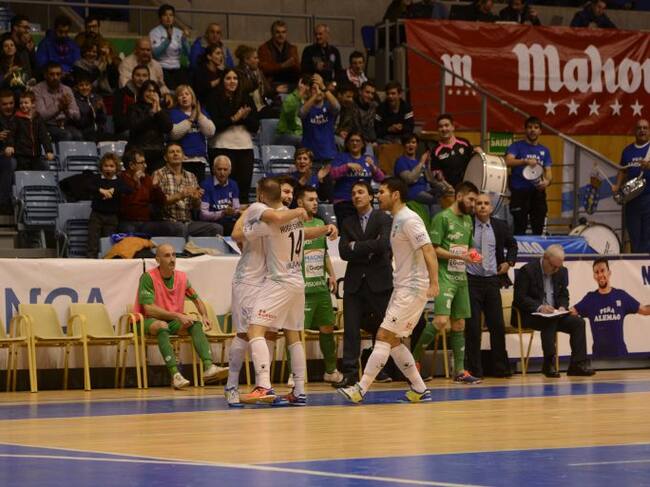 Catela y Hugo Sánchez (de espaldas) celebran el primer gol ante la mirada de Dani Montes / Santiago Futsal