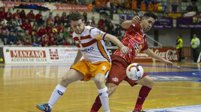 Josema y Bebe pelean por un balón en el derbi entre ElPozo Murcia y Plásticos Romero Cartagena (Foto: Pascu Méndez / LNFS)