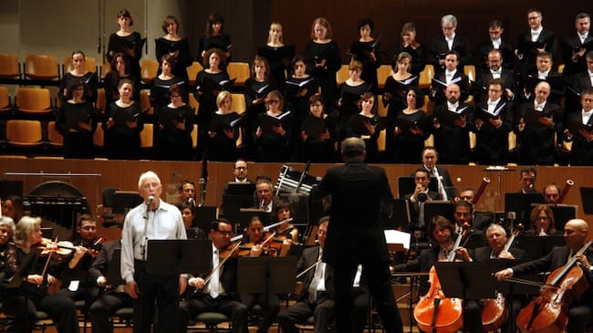 Raimon interpreta una de les canciones con la Orquestra de València en el recital que ha ofrecido en el Palau de la Música de València / José Soler (ACN)