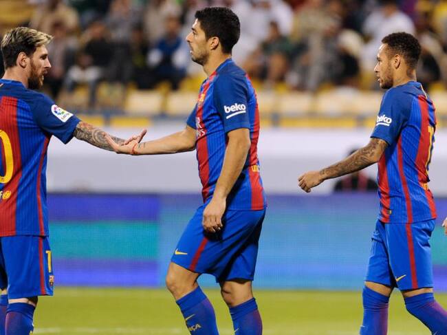 Messi, Suárez y Neymar celebran un gol ante el Al Ahli / Noushad Thekkayil (EFE)