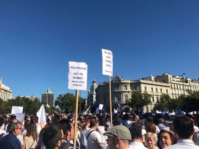Algunas de las consignas que se han lanzado por los asistentes, con vestimenta de color blanco y que han abarrotado las inmediaciones de Cibeles han sido 'Catalanes, hermanos no somos Mariano', 'Bla bla bla queremos hablar', 'Menos odio y más conversación' o 'Menos porrazos y más telefonazo', al mismo tiempo que han alzado una bandera blanca.