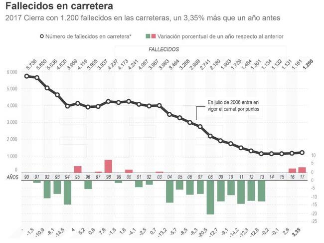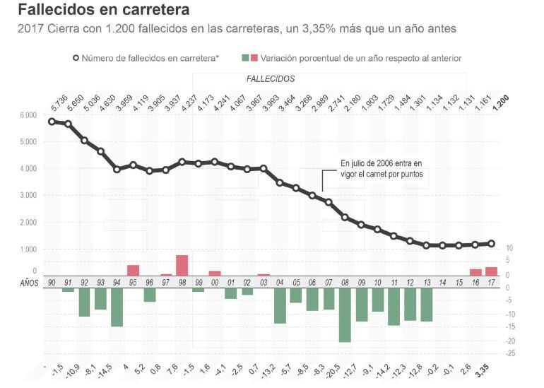 Supone la peor cifra de víctimas mortales desde 2013. En todo caso, 2017 se convierte en el segundo año consecutivo en que se incrementa el número de víctimas mortales en las carreteras después de 14 años seguidos de descensos en los fallecidos.