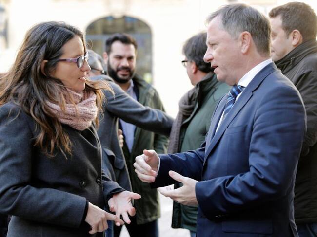 La vicepresidenta del Consell, Mónica Oltra y el Delegado del Gobierno, Juan Carlos Moragues, conversan momentos antes de guardar tres minutos de silencio para condenar el último asesinato por violencia machista de la joven de Villarreal, Andrea Carballo, / JUAN CARLOS CARDENAS (EFE)