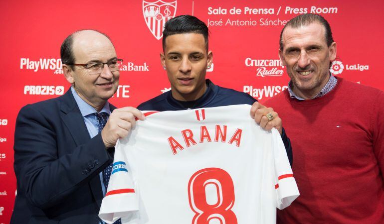 La presentación de Arana, como es habitual, se convirtió en un aluvión de declaraciones sobre todos los asuntos que rodean a la turbulenta actualidad del Sevilla. El jugador comentó que está en buen estado de forma: "Me he entrenado mucho durante las vacaciones y estoy en condiciones de jugar cuando lo estime el entrenador. Mi referente en el juego siempre ha sido Roberto Carlos". Lo más interesante, Pepe Castro y Oscar Arias.