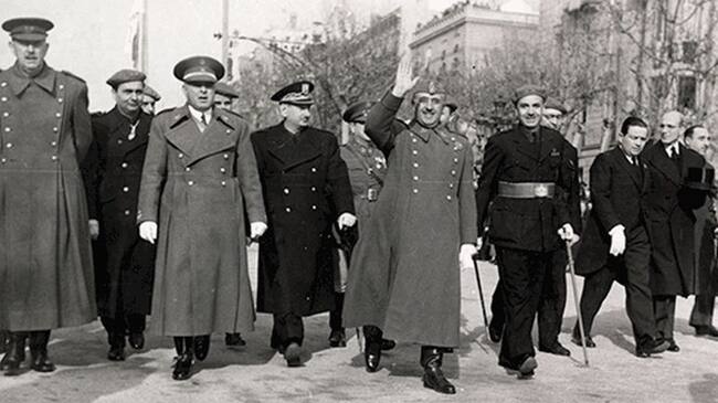 Miguel Mateu, a l'esquerra de Franco, en una visita del dictador a Barcelona, en els primers anys de la postguerra / Ajuntament de Barcelona