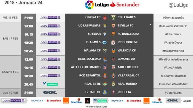 Por el momento, los días y horarios de los encuentros del Málaga están situados hasta el Valencia. Este sábado 27 de enero recibirá al Girona a las 18:30 horas; el lunes 5 de febrero visitará a Las Palmas a las 21 horas, y los dos citados anteriormente contra el Atlético de Madrid y el Valencia.