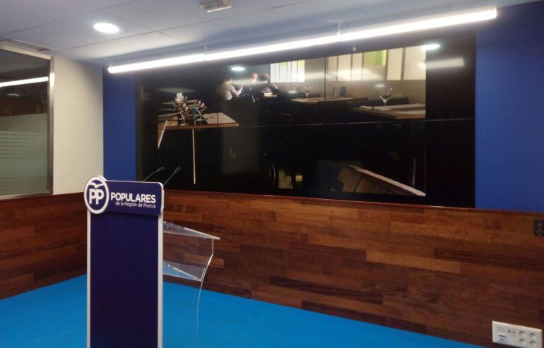 La sala de prensa del PP en su sede regional ha estado este lunes decorada en su 'videowall' con la imagen publicada este pasado fin de semana por La Opinión en la que el exfiscal jefe, Manuel López Bernal, conversa en la cafetería de un céntrico restaurante de Murcia con el portavoz del PSOE en la Asamblea Regional, Joaquín López, y un exmiembro de los servicios jurídicos de este partido.