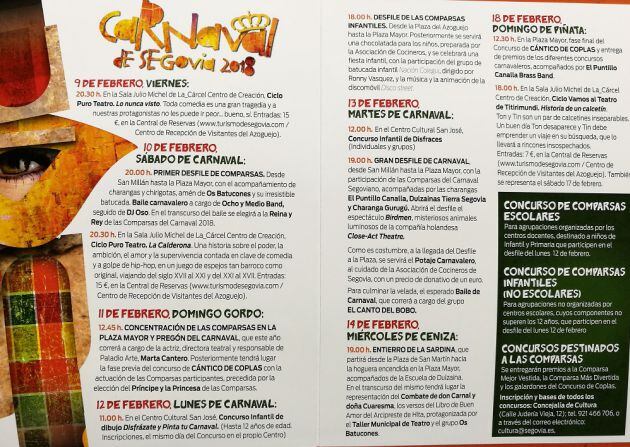 El Carnaval llega a Segovia un año más cargado de actividades con las que podrán disfrutar los niños y los adultos, con especial protagonismo de las comparsas de la ciudad, que como siempre se vuelcan porque esos días se conviertan en una fiesta en la que participe toda la ciudadanía. Este año participan las comparsas: Apadefim, Los Chirigoteros, Para que tú lo bailes, Pasitos, Semaforitos, Semifusa y Vacceos.