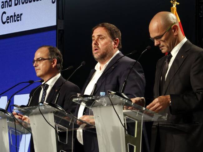 Jordi Turull, Oriol Junqueras, i Raül Romeva, el 2 d'octubre de 2017, compareixen per donar els primers resultats de l'1-O / ACN