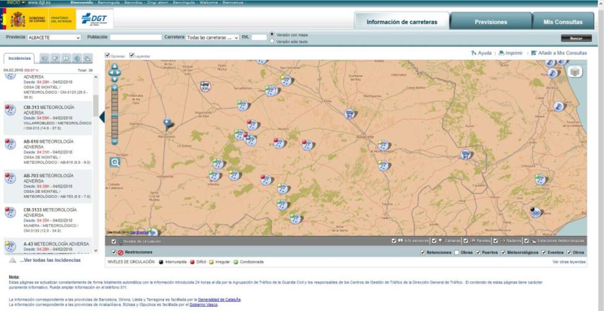 La página web de la DGT reflejaba este domingo por la mañana numerosas incidencias