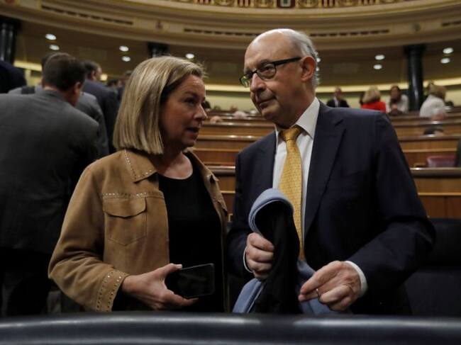 El ministro de Hacienda, Cristóbal Montoro, conversa con la diputada de CC, Ana Oramas,durante la sesión de control al Gobierno celebrada hoy en el Congreso de los Diputados. / Juan Carlos Hidalgo (EFE)