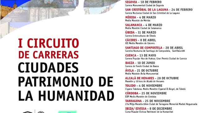 El I Circuito de Carreras Ciudades Patrimonio de la Humanidad se desarrollará desde el 18 de febrero, día en que arranca en Segovia la Carrera Monumental Ciudad de Segovia, hasta el 8 diciembre de 2018, en que la Cursa Popular Eivissa Patrimoni de la Humanitat cierra la serie de pruebas. Las carreras cubren distancias que oscilan entre los 10 km y la Media Maratón, y de las 15 que integran el Circuito será necesario finalizar al menos 5 de ellas para optar a la clasificación final.