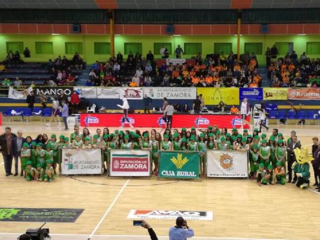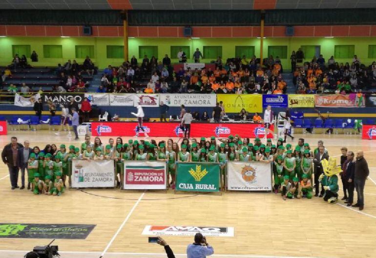 Las jugadoras de la cantera saltaron al Ángel Nieto en el descanso del partido de Liga Femenina, que por unos minutos tiñó de verde la pista, dado que el uniforme de las canteranas es verde, dado que el patrocinio de todos los equipos corresponde a la Caja Rural de Zamora.