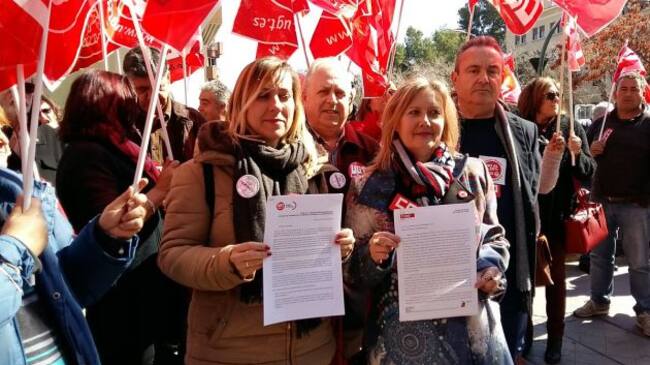 Antonio Jiménez y Eugenia Pérez de UGT y Santiago Navarro y Anna Mellado de CCOO han presentado un escrito en la Deleación del .Gobierno de Murcia para exigir al Gobierno de España una Ley de Igualdad Salarial