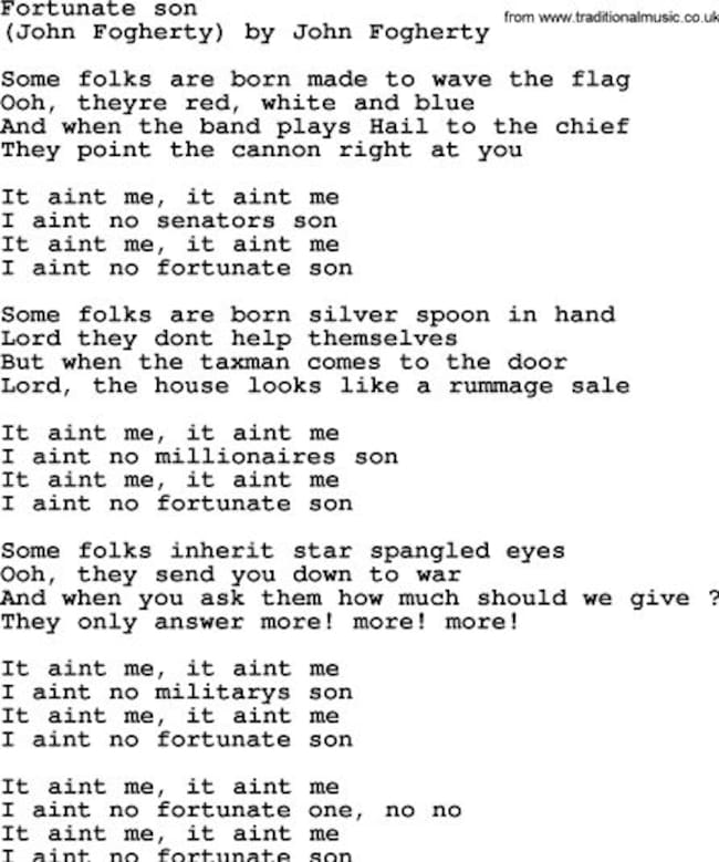 Si eras hombre, blanco o negro, daba igual, pero joven, de unos dieciocho o veinte años de edad, si eras pobre y no comías en cuchara de plata, era seguro que te obligaran a ir a la guerra y era muy probable que te mataran o quedaras herido o inútil para siempre. Si eras pobre, ojo; porque si eras el hijo de un senador o el hijo de un general te librabas de ir a la guerra. 'It aint’ me, it ain’t me, ain’t no senator son, no'. Esa frase de rabia es la que recorre toda la canción, un estribillo que se queja de que “yo no soy, yo no soy, yo no soy el hijo del senador, no”.
