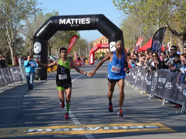 En hombres tras los 10 kilómetros de recorrido, entraron juntos cogidos de la mano, Youssef Ahatach, del Club Atletismo Baleària Diànium, y Moha Rida, del Club Atletismo Llebeig Xàbia.