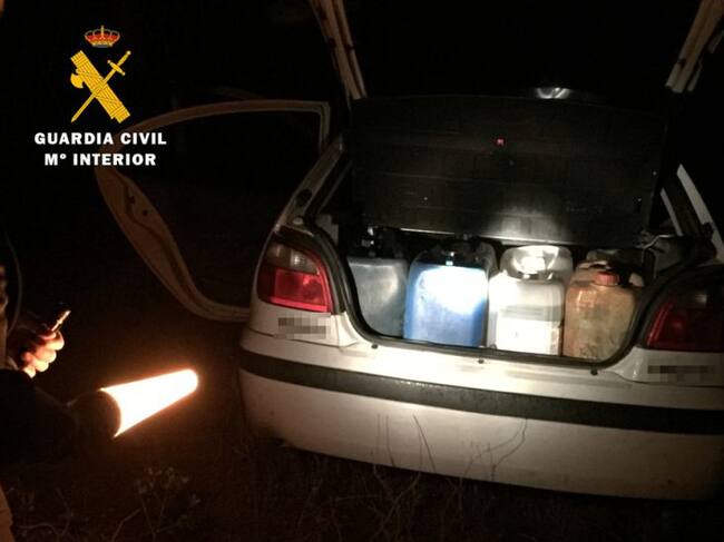 En el maletero del vehículo se localizaron 8 garrafas de 25 litros de las cuales tres contenían gasóleo. Además, en el registro se hallaron una manguera de goma y una pipeta, ambas impregnadas en carburante.