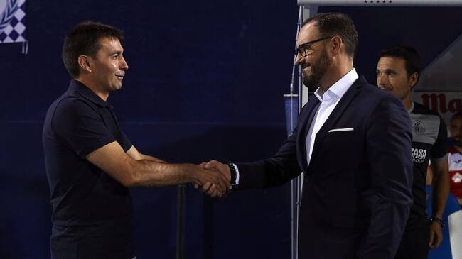 Asier Garitano (i) y Pepe Bordalás se saludan durante el derbi de la primera vuelta en Butarque. / fotopress/Getty Images