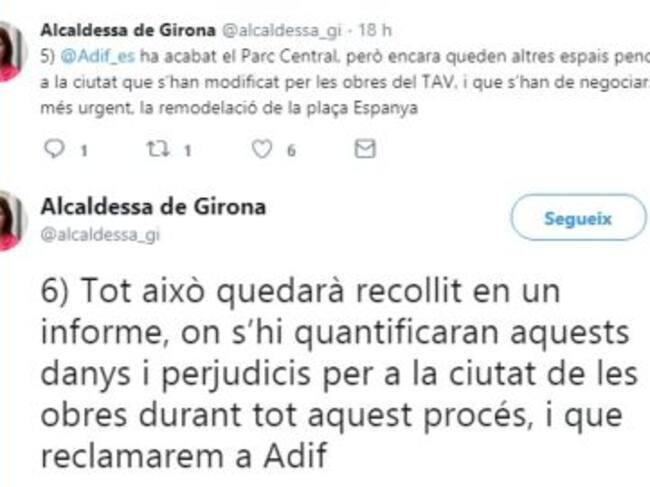 Ho ha fet al seu perfil oficial de tuiter, on ha recordat que no obliden el patiment dels veïns durant els 10 anys de les obres, que el consistori ha assumit costos d'alguns treballs per no penalitzar-los més, que hi ha altres espais modificats a la ciutat per les obres de l'AVE que s'han de neogicar com la Plaça Espanya i que tot quedarà recollit en un informe quantificant els danys i perjudicis a la ciutat per poder-los reclamar a Adif.