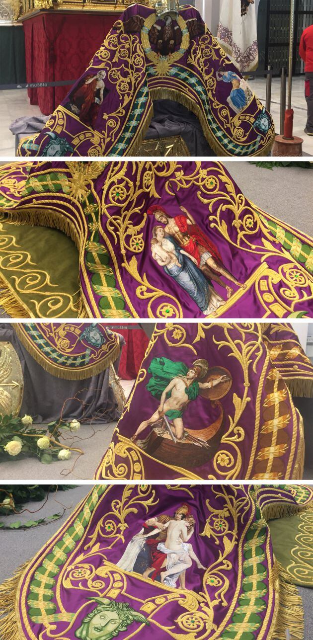 ¿Qué representa? Estos cuatro mantos representan a personajes y pasajes de la 'Eneída' de Virgilio, la gran epopeya romana que emparentaba el origen de Roma y de Augusto con el linaje de los héroes troyanos. Eneas, Elio, Dido y Lavinia se reparten el protagonismo en cada uno de los mantos en los que también se representan a figuras como Ácates, Elio y Crota, Pigmalión o Turno.