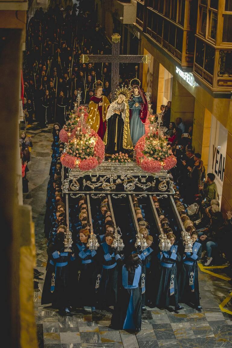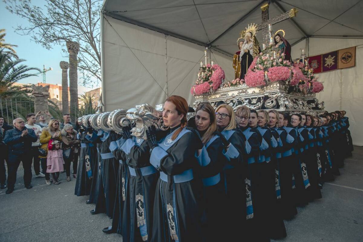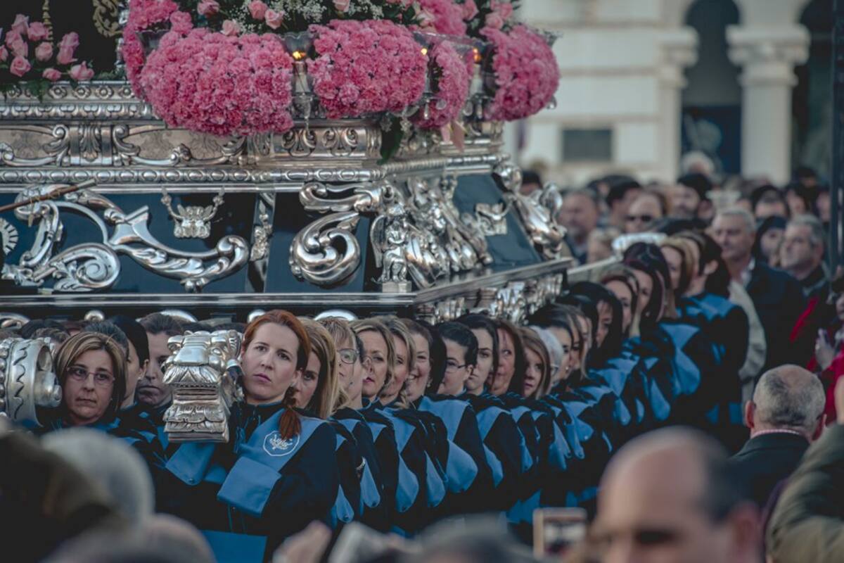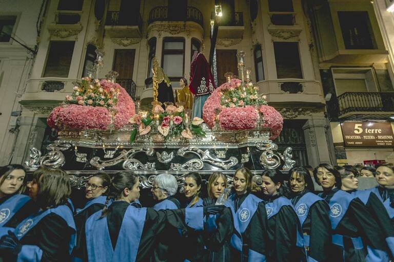 Trono llevado a hombros por la Agrupación de las Santas Mujeres en la procesión del Sábado Santo.