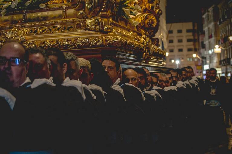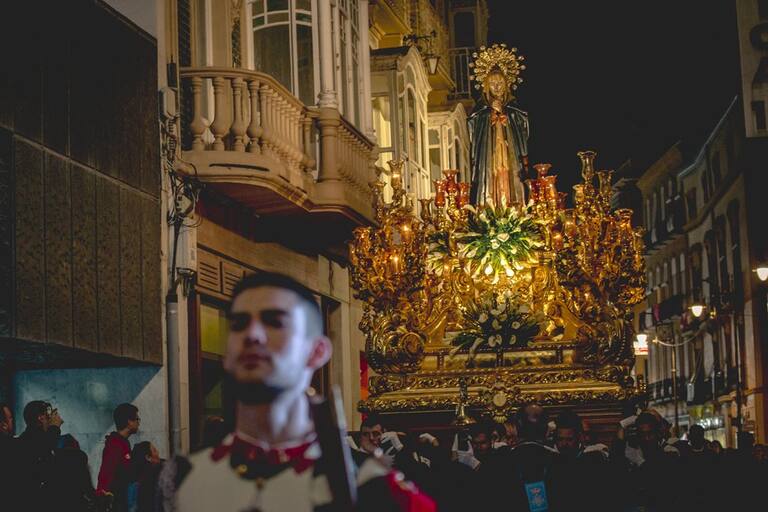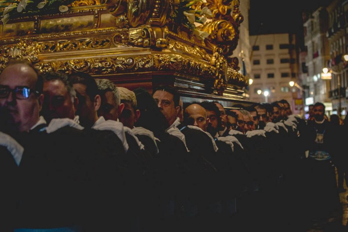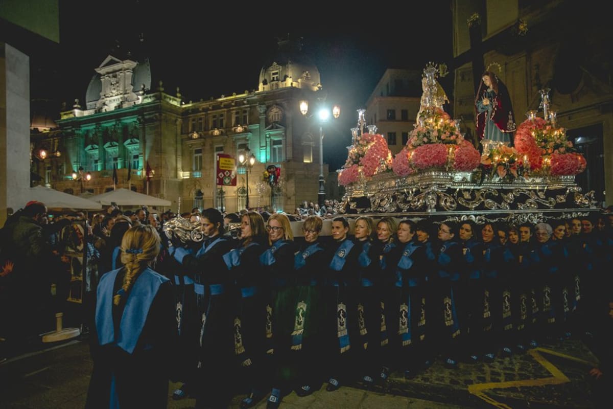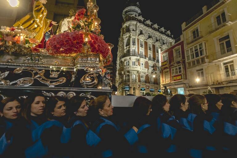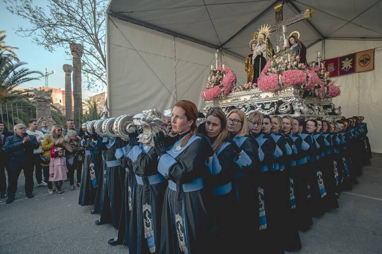Trono llevado a hombros por la Agrupación de las Santas Mujeres en la procesión del Sábado Santo.