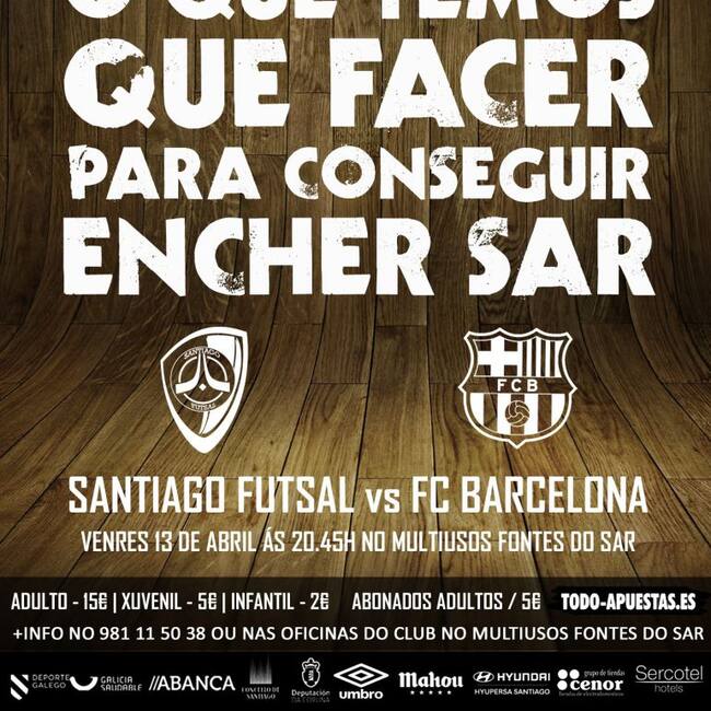 El encuentro ante el conjunto de la ciudad condal ha sido declarado por el Santiago Futsal como “Día del Club” por el que todos los asistentes, abonados y no abonados, tendrán que adquirir entradas para asistir al partido. El precio de las entradas para no abonados mayores de 18 años es de 15€, mientras que la de categoría juvenil (14-17 años) es de 5€ y la de infantil (4-14 años) es de 2€. Los abonados del club mayores de 18 años también tendrán que retirar la entrada que tendrá un precio de 5€. Los abonados menores de edad accederán gratuitamente con su carnet.