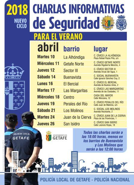 El Cuerpo Nacional de Policía Nacional y la Policía Local de Getafe imparten, desde este martes y hasta final de mes, una serie de charlas destinadas a mayores con consejos para mantener sus viviendas protegidas durante las vacaciones de verano.
