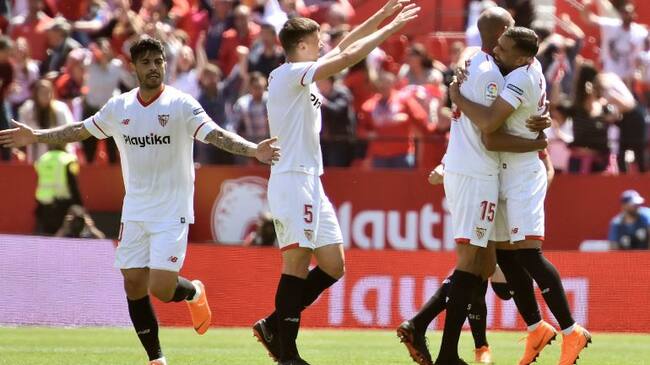 GRAF3701. SEVILLA.- Los jugadores del Sevilla celebran tras el gol anotado por el centrocampista francés Steven N'Zonzi (2d), durante el partido de hoy contra el Villarreal en el Estadio Sánchez Pizjuan, correspondiente a la jornada 32 de LaLiga. EFE Raul / RAUL CARO CADENAS (EFE)