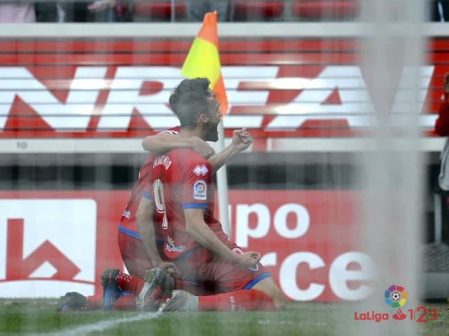 Higinio e Íñigo Pérez celebran uno de los goles del murciano ante el Lugo. / laliga.es