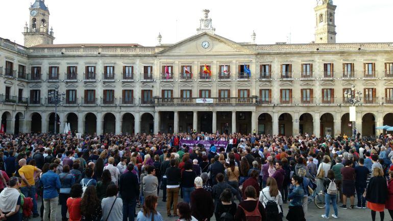 Varios centenares de ciudadanos además de representantes institucionales y políticos se han concentrado en la Plaza de España de Vitoria para expresar su repulsa por el doble crimen machista y en solidaridad con los familiares y amigos de las dos mujeres asesinadas, Florentina y Maria José.