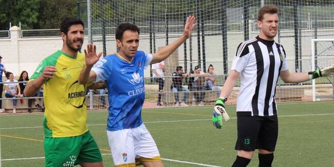 Pedro Carrión junto al guardameta de Los Barrios y Dani Hedrera / Xerez CD