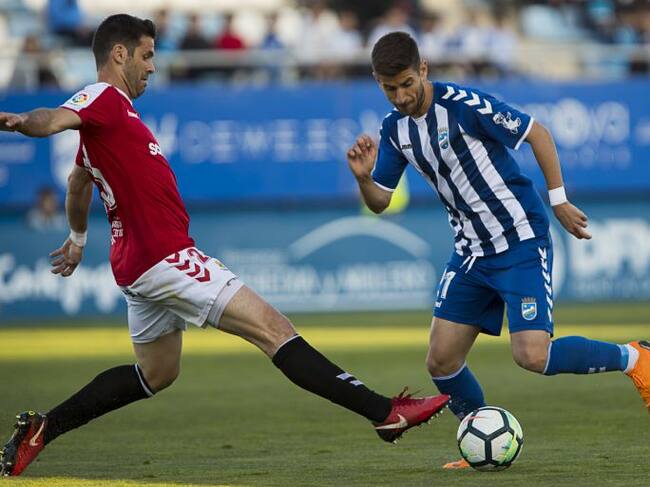 Ojeda intenta regatear a César Arzo en el Lorca FC-Nàstic (Foto: Pascu Méndez)