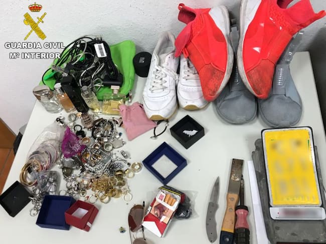 Los efectivos de la patrulla procedieron al registro superficial del ahora detenido, encontrando ocultas entre la ropa joyas, algunas de oro y diamantes, así como diversa bisutería. Además, se le intervinieron varios pares de zapatillas deportivas, un destornillador, una navaja, una espátula y un cúter.