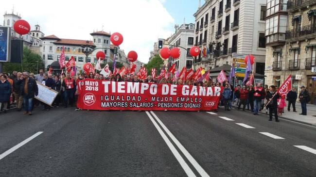 Miles de personas han secundado la manifestación del Primero de Mayo convocada por Comisiones Obreras y UGT en Santander, donde los líderes de ambos sindicatos han exigido que se reparta la riqueza al tiempo que han amenazado, en caso contrario, con movilizaciones. Así, si no hay "reparto", habrá "conflicto", han advertido durante la concentración con la que han clausurado la marcha por las calles de la ciudad, en unos discursos en los que se ha 'colado' la "impresentable" sentencia de 'La Manada'.