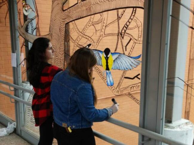 Alumnos de la Escuela de Arte N1 dibujan un mural en una cristalera donde los pájaros morían por colisión