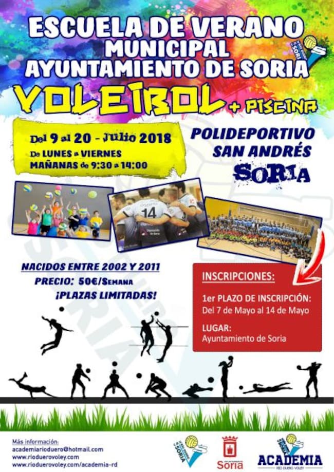 Los jóvenes de Soria podrán disfrutar este próximo mes de julio de una nueva escuela de verano municipal: de voleibol. Impulsada por el Ayuntamiento de la capital y el CDV Río Duero Soria, a través de su Academia, los niños y niñas nacidos entre 2002 y 2011, podrán disfrutar de este deporte y de otras actividades lúdico-recreativas en el Polideportivo San Andrés.