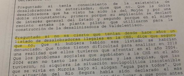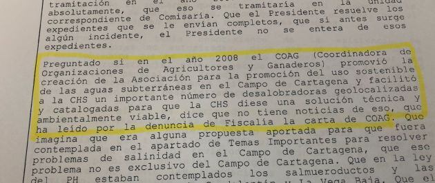 Hay algo muy llamativo en su declaración. Dice Zorita, en varias ocasiones, que nunca tuvo constancia de la ya famosa carta de COAG de 2008 en la que la organización dice que le entregó a la CHS un listado de desalobradoras "geolocalizadas y catalogadas para darle una solución técnica". Este punto es clave porque los agricultores acusan a los distintos gestores de la CHS de no haberles hecho caso.