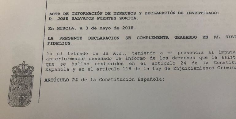 El escrito del Juzgado de Instrucción Número 2 de Murcia, al que ha tenido acceso la Cadena SER es el "acta de declaración del investigado D. José Salvador Fuentes Zorita". Asisten a esta declaración el juez, el ministerio fiscal y los letrados de la acusación y de los numerosos imputados de la causa. Su voz fue grabada por el sistema fidelius.