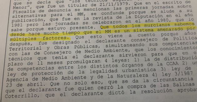 También le preguntan por la llamada "Comisión del Mar Menor". Recuerda que la impulsó la CHS para "tratar de coordinar a todas las administraciones" en la defensa de la laguna. Sin embargo, recuerda "fue dinamitada en febrero de 2008 porque se salieron de ella el Ayuntamiento de Cartagena y la Comunidad. En ese momento ambos organismos públicos los gobernaba el PP, dice, y "evitaron la posibilidad de hacer nada".