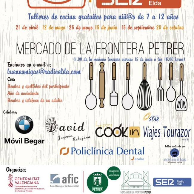 PREMIOS EVENTO: TALLERES DE COCINA PARA NIÑOS Setenta y dos(72.-) plazas para asistir, de manera gratuita, a los talleres de cocina “BUENAS MIGAS” que organiza RADIO ELDA Cadena SER en el Mercado Frontera de Petrer ubicado en Carrer Camí Vell d'Elda, 18 , Petrer, en las fechas indicadas durante los meses de Abril a Octubre 2018, con un total de nueve (6.-) talleres con doce (12.-) plazas cada uno.