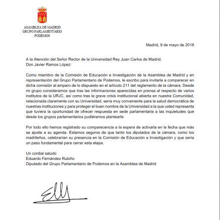 Podemos ha enviado una carta al rector de la Universidad Rey Juan Carlos, Javier Ramos, en el que lo invita a acudir a sede parlamentaria para dar explicaciones "ante la grave crisis institucional que se ha abierto en la Comunidad de Madrid por culpa de las irregularidades" relacionadas con el fraude del máster de Cifuentes.