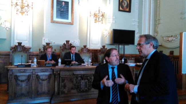 José Antonio Martínez Bermejo conversa en un pleno con el secretario del Ayuntamiento. Detrás Óscar Puente y Manuel Saravia / José María Francisco