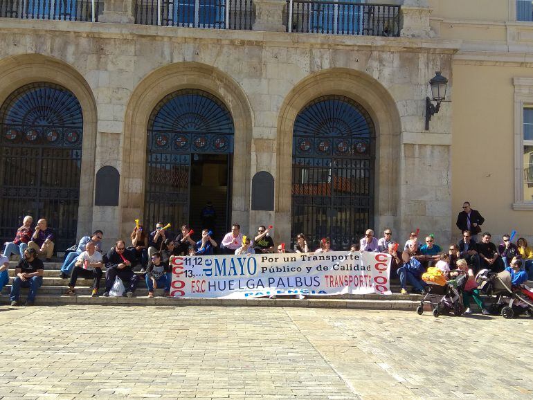 Concentrados a las puertas del Ayuntamiento de Palencia. Así esperan los trabajadores de la empresa concesionaria del servicio de transporte urbano, Palbús, noticias sobre el desarrollo de los acontecimientos en torno a la huelga que cumple su tercer día. La concentración se produce coincidiendo con un encuentro en el consistorio entre los servicios técnicos y jurídicos de la empresa y del Ayuntamiento para ver posibles fórmulas que permitan paliar la deuda que arrastra la concesionaria.