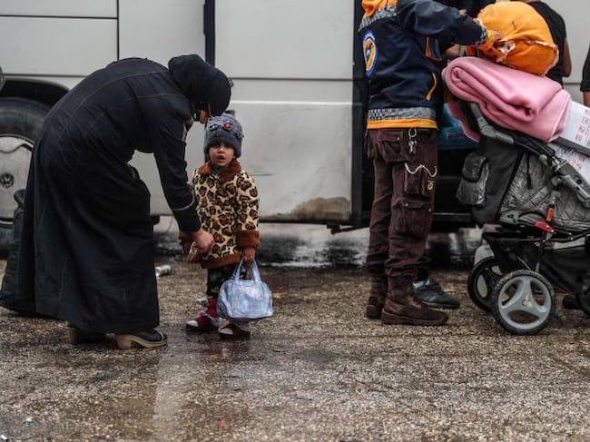 Personas que fueron desplazadas por la fuerza de las ciudades al sur de Damasco llegan al cruce de Qal'aat al-Madiq en el campo norteño de Hama (Siria). / MOHAMMED BADRA (EFE)