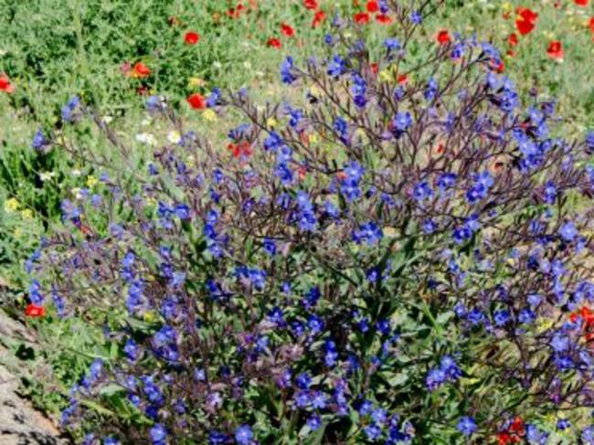 La chupamieles o algamula -Anchusa azurea- es una planta que lleva pocos días florecida en la zona. De un color azul intenso hasta violáceo, es una planta muy popular en la cultura manchega. Sus raíces generaban al machacarlas un polvo rojo usado como colorete. Sus hojas eran consumidas en cocina y se podían macerar. Se decía que su ingestión en aguardiente volvía alegres a las personas tristes. Se habla incluso del vino de lengua de buey, muy popular en la zona del sur de la provincia que mezclaba vino blanco con flores que se maceraban durante semanas. Era utilizado para abrir el apetito.
