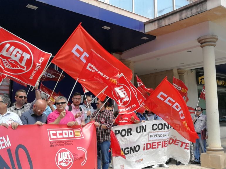 UGT y Comisiones Obreras se han concentrado este mediodía frente a la sede de la patronal empresarial CAEB en Palma, una jornada de lucha de ámbito estatal para exigir mejoras salariales y laborales.