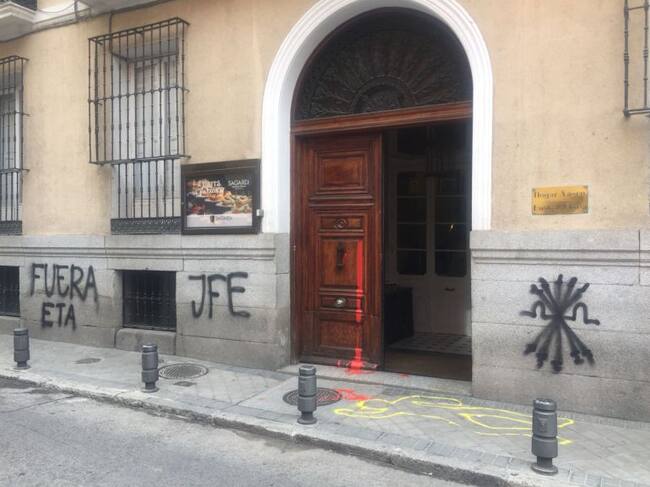 La Casa de la Cultura Vasca en Madrid ha aparecido hoy con pintadas en las que puede leerse "Fuera ETA" y las siglas de las Juventudes de la Falange Española, además de una silueta humana en el suelo y manchas de pintura roja a su alrededor y en la puerta.