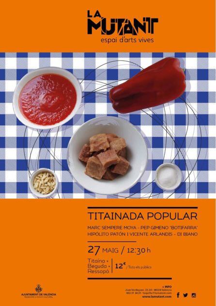 Conducida por el polifacético artista de Cocentaina Marc Sempere Moya, la propuesta consistirá principalmente en la elaboración en directo de la receta de la Titaina –un manjar cabanyalero hecho a base de tomate maduro, pimiento rojo, piñones, ajo, atún y aceite de oliva– a cargo de cuatro mujeres de Barris Marítims. Mientras el plato se prepara, se establecerá un diálogo artístico-cultural donde no faltarán las canciones al mar de Pep Gimeno “Botifarra”, la “Performance Municipal” de Hipólito Patón y Vicent Arlandis o las impresiones de Marisa Villalba y Felip Bens acerca de las costumbres y platos característicos del Cabanyal.