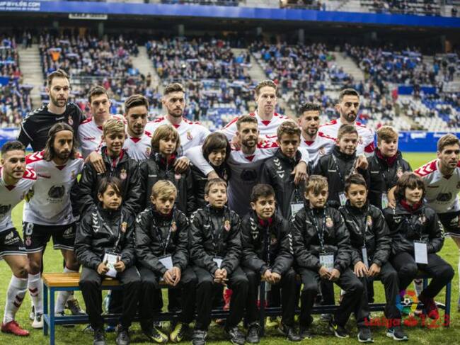 El once de la Cultural en el Tartiere posa con una representación de la cantera del club / La Liga